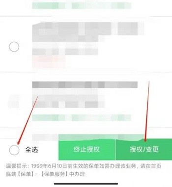 4.进入续期交费设置,勾选【全选】,然后再点击【授权/变更】即可