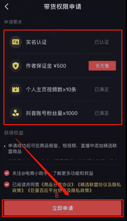 注意:不满足以上任一要求都无法开通抖音商品橱窗。