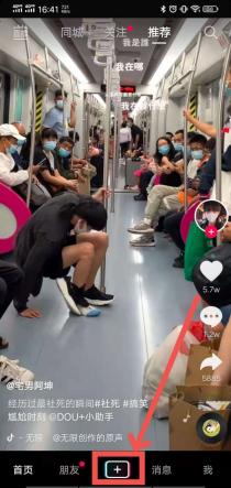 打开抖音短视频APP之后,点击页面下方的“+”按钮。
