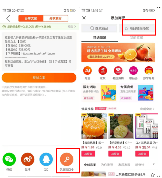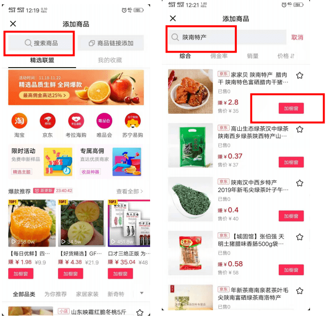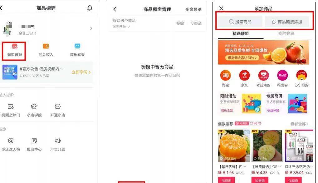 • 如果自己没有店铺也没有货源,可以添加【精选联盟】商品。通过搜索和视频相关的高佣金商品并添加到橱窗,推广销售赚取佣金。