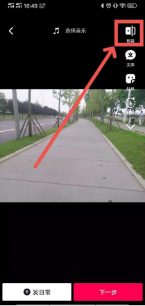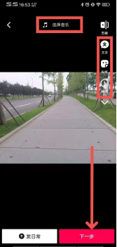 剪辑完成之后,可以在这个页面为自己剪辑过后的视频加上字幕,方便观看视频的用户更好的理解视频内容;还可以给视频加上一些自己比较喜欢的贴纸,让视频的风格显得可爱一些;除此之外,也可以给视频加上一些比较简单的特效,增强视频的观赏感。在页面上方的正中间的位置还可以选择视频的背景音乐,增加视频的节奏感。以上操作都完成之后,直接单击页面右下角的“下一步”红色按钮。