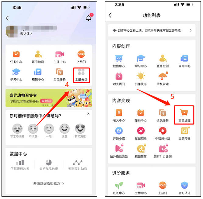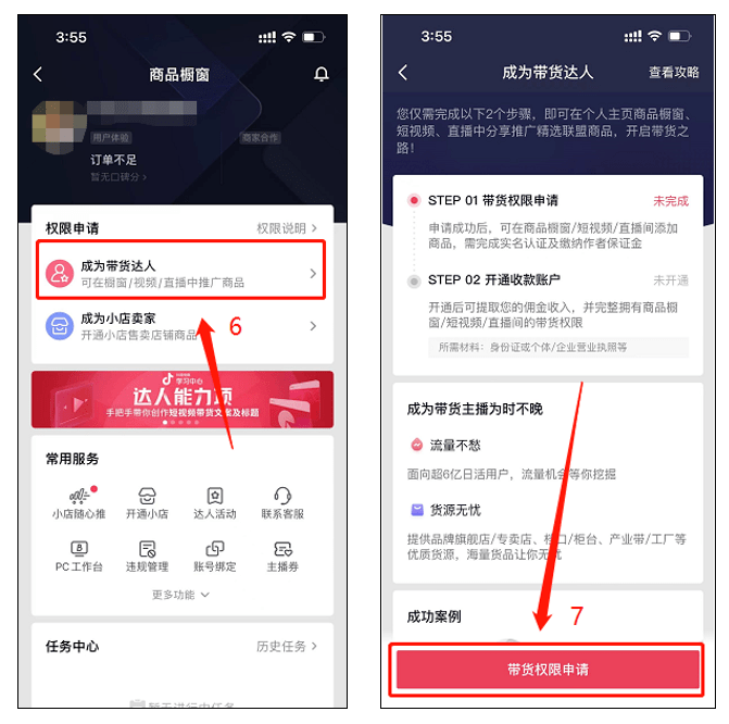 ★开通途径:打开抖音APP,依次点击【我】—【创作者服务中心】—【全部分类】—【商品橱窗】—【成为带货达人】—【带货权限申请】—确认符合4个开通要求后,点击【立即申请】即可。