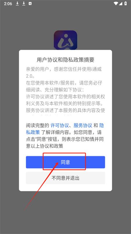 1、下载安装并打开i通威2.0,先同意用户协议和隐私政策摘要。
