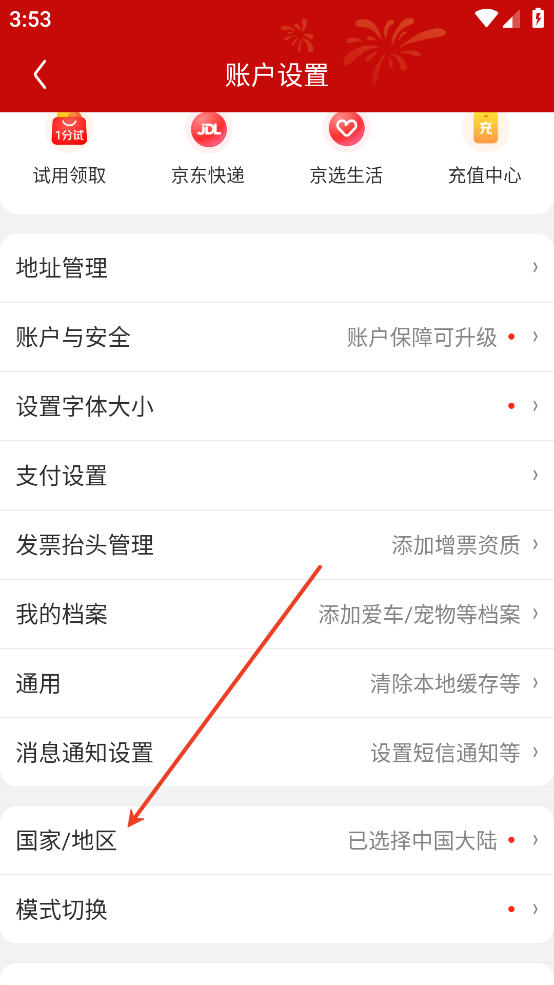在打开的帐户设置页面中,我们点击菜单列表中的“国家/地区”菜单项。