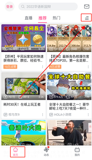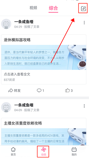 1、登录软件后,点击动态,选择视频或是综合,点击右上方;