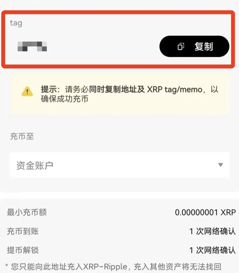 5. 部分币种在生成提现地址时会同时生成标签(Memo/Tag),例如XRP,标签通常是一串数字,提现这些币种时必须需要填写提现地址和标签,否则提现不会到账。