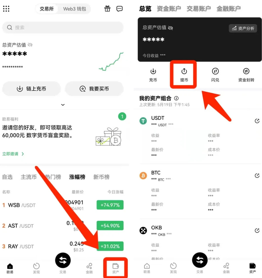 提币是指将欧交易所账户中的币通过链上提现或内部转账转入至其他交易所账户或钱包。