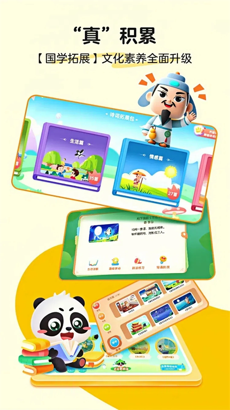 【趣味动画】演绎诗词创作故事,代入场景,建立对古诗的理解。【唱诵结合】强化诗词节奏及韵律感知,不担心发音和趣味性。【知识拓展】文学常识、历史典故拓展,提升文学素养。【复习巩固】古诗场景、意向通过图片等选择形式出现,互动练习,强化认知。【诗词诵读】专业老师领读,鼓励开口表达,精准评测。【游戏复习】记忆宝箱,趣味游戏复习,有学有练效果更好。【个性化学习报告】查漏补缺,及时反馈,激发学习兴趣。【诗词电台】无限回放,随时随地磨耳朵。