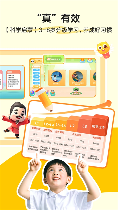 精选【经典必备古诗】,基于孩子语言表达及心智发展路径和特点,结合AI技术进行科学分级、智能规划,打造了7级科学学诗规划,级别0-6无感知难度进阶,满足不同孩子学习水平、目标和兴趣需要。