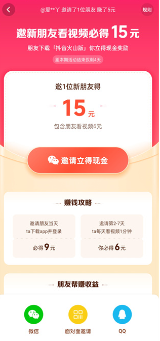 目前通过赚钱的方式有多种如:邀请好友、看视频、抽奖、发布视频。