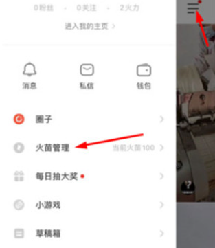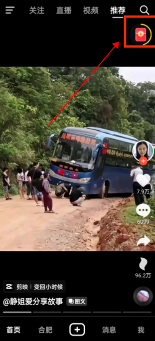 1、首先打开抖音火山版软件,进入到首页中后我们可以在右侧的上方看到有【红包图标】点击;