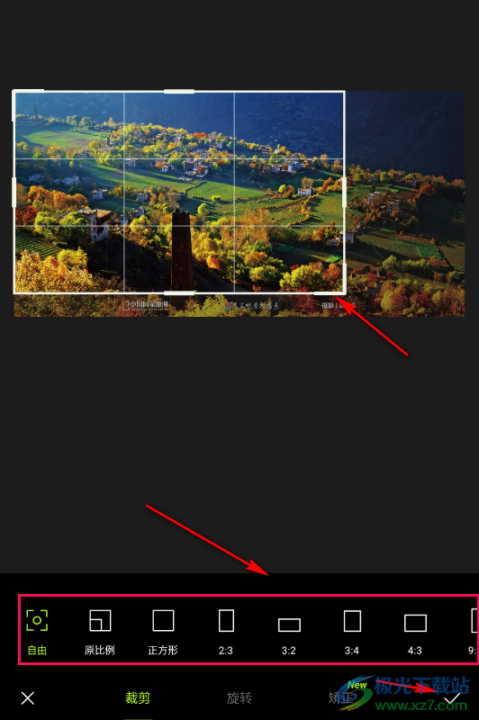 4、第四步,接着在构图页面中我们可以选择自由模式,更改框的大小对图片进行框选,也可以使用下方的比例对图片大小进行更改,设置完成之后点击“√”即可