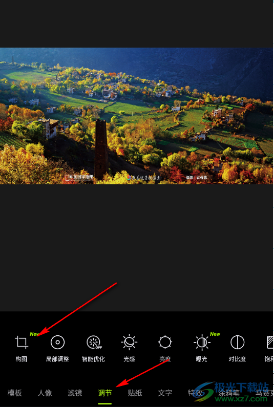 3、第三步,打开图片之后我们在图片编辑页面中找到“调节”选项,点击打开该选项,接着我们点击调节页面中的“构图”工具