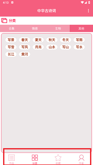 2、分类页面:可以查看提供的收藏、情感、生物、其他诗歌类别。