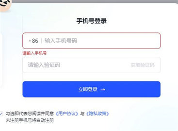 2、输入手机号码,验证码等即可登录,未注册手机号将自动注册