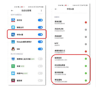②开通通知权限:设置-应用设置-授权管理-应用权限管理-中铁e通-锁屏显示、后台弹出界面、显示悬浮窗、常驻通知。