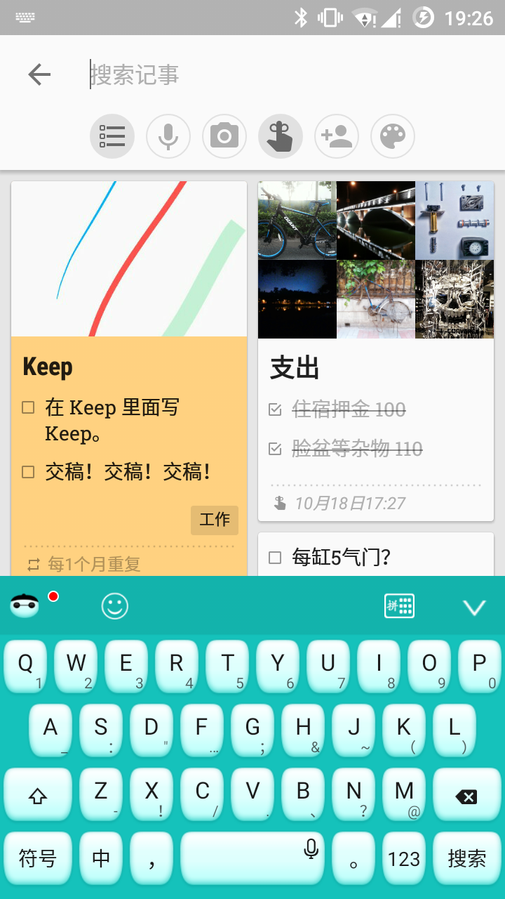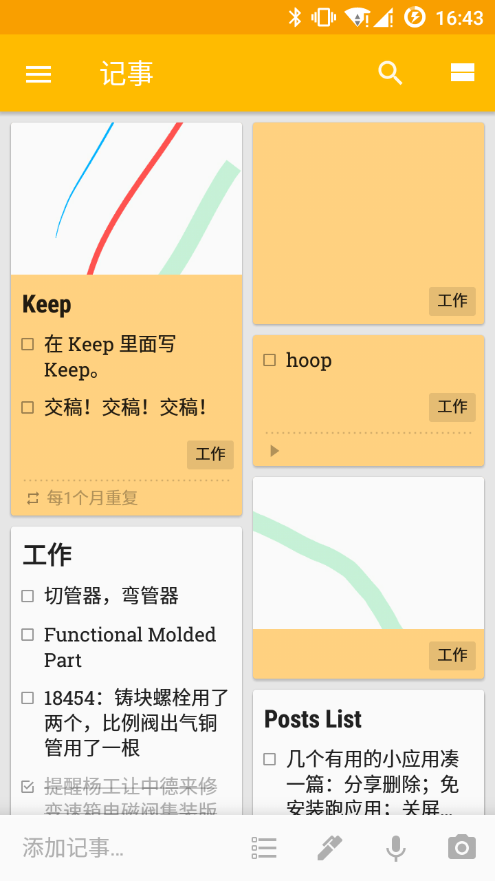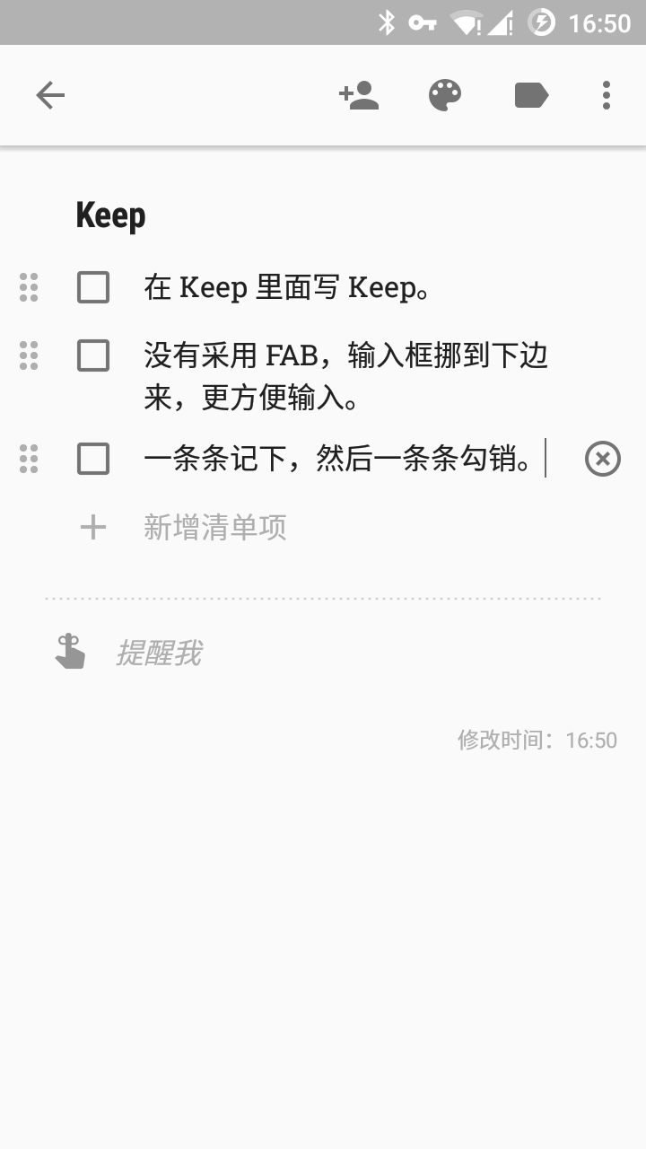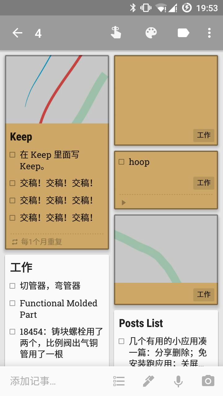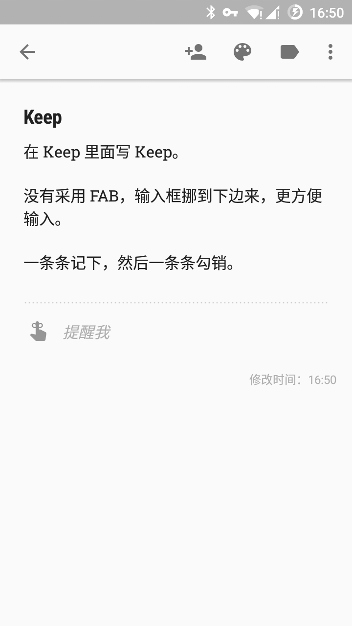 从大类上来讲,Keep 的记事类型有普通记事和清单记事两种。普通记事不能实现图文混排,只能实现图文分离排布,所以我偶尔会用普通记事打打文字草稿;清单记事日常用的比较多,列一些购物清单、文章题纲、待办事项等等都是极好的。在清单记事中,可以对清单进行一定的自定义设置,使之更符合自己使用的一些习惯。之前在试着用Parchi替代 Keep 时,打了勾的清单项会保持原位,又没个可以调节的地方,这也让我一度不习惯。