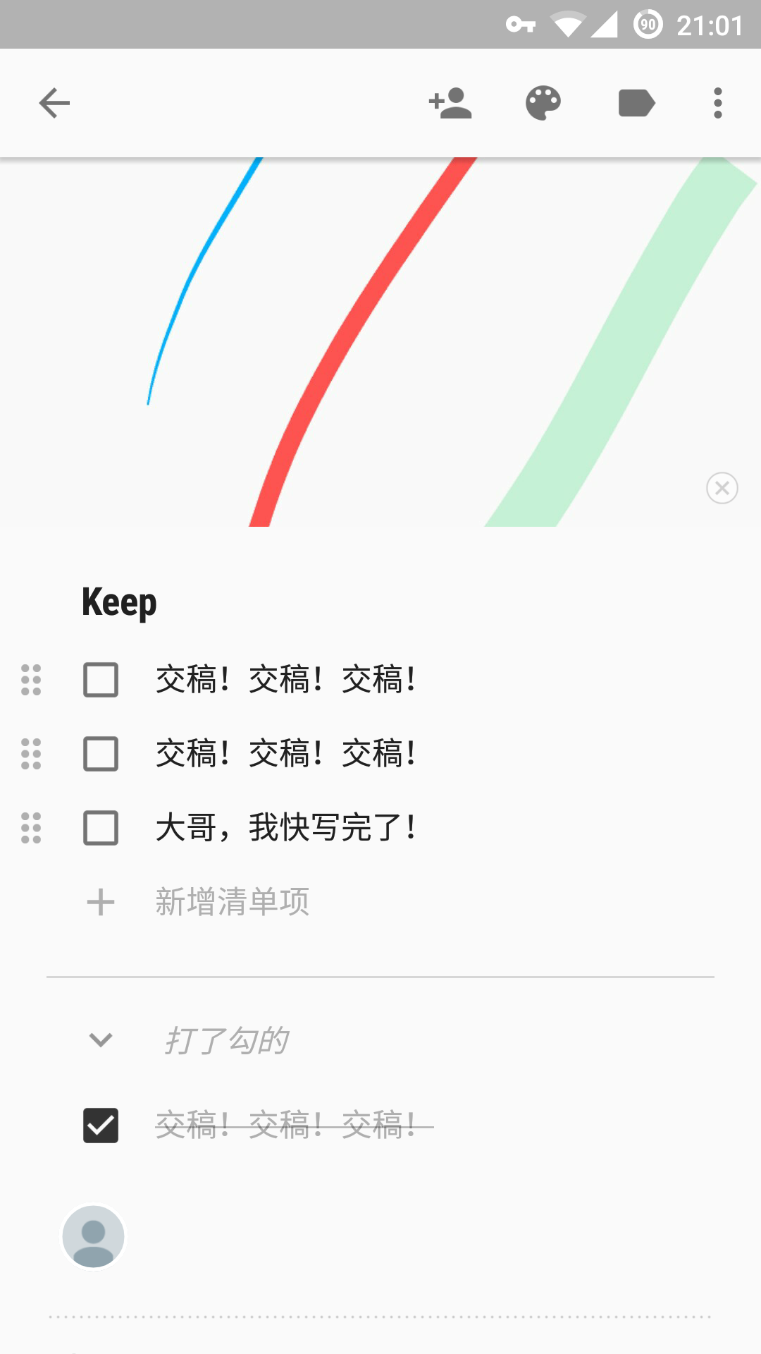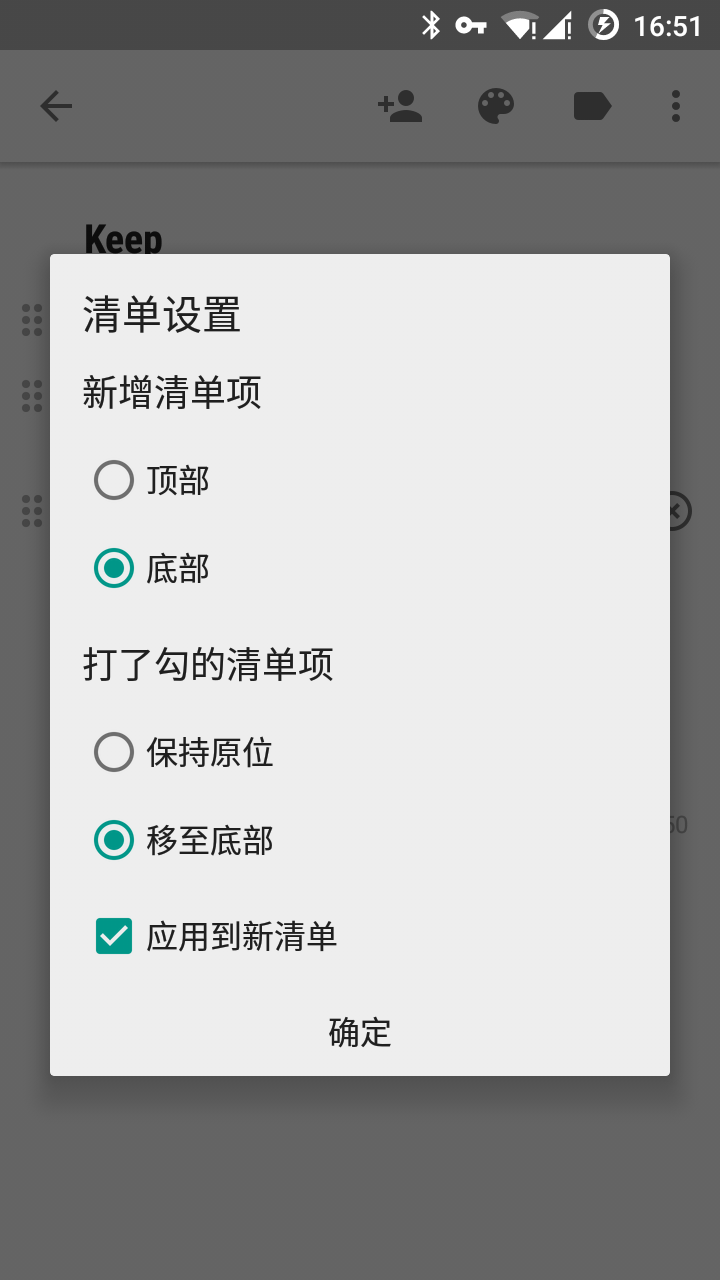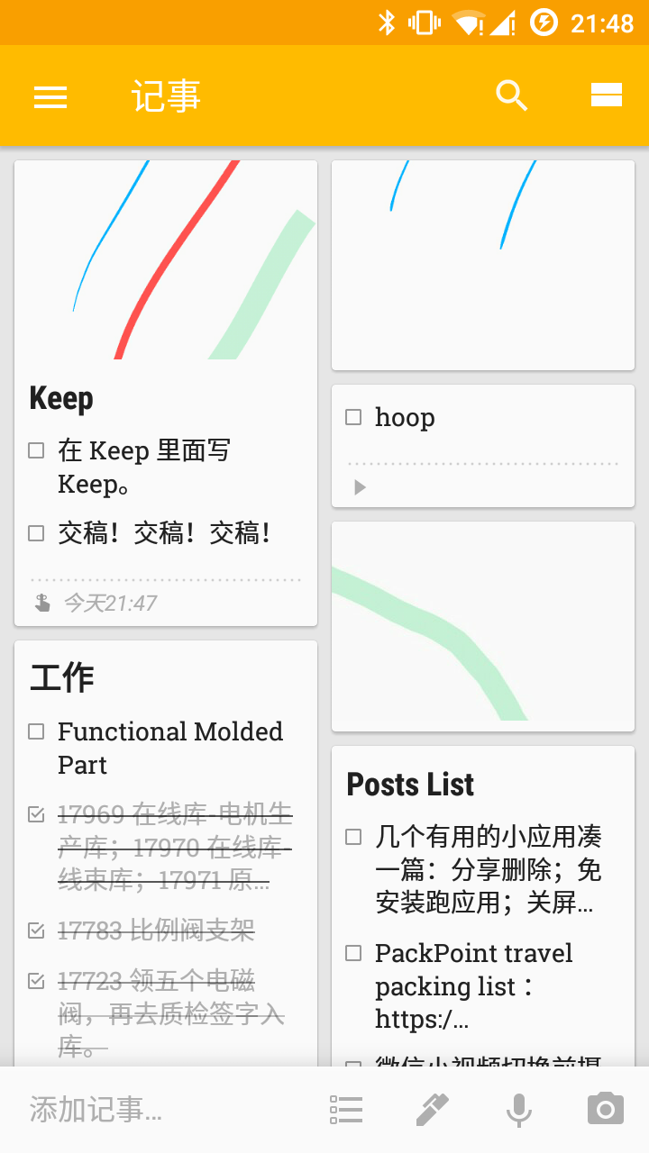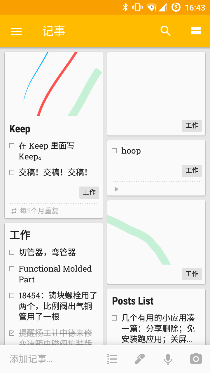 从大类上来讲,Keep 的记事类型有普通记事和清单记事两种。普通记事不能实现图文混排,只能实现图文分离排布,所以我偶尔会用普通记事打打文字草稿;清单记事日常用的比较多,列一些购物清单、文章题纲、待办事项等等都是极好的。在清单记事中,可以对清单进行一定的自定义设置,使之更符合自己使用的一些习惯。之前在试着用Parchi替代 Keep 时,打了勾的清单项会保持原位,又没个可以调节的地方,这也让我一度不习惯。