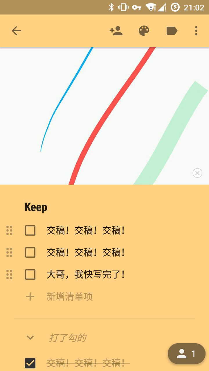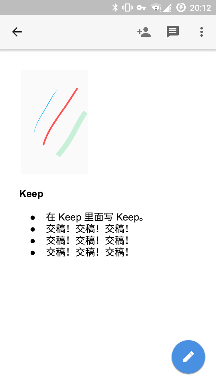 绘制的内容会以图片的形式插入到新建记事中,并且这张图片仍旧是可编辑的。当你想要继续在这张图片上绘制内容时,可以点击这张图片,之后点击右上角的画笔按钮即可重新进入绘图界面。Keep 的这项绘图功能虽然并不十分复杂,但作为记事应用中的一项附加功能,应该是足够了。