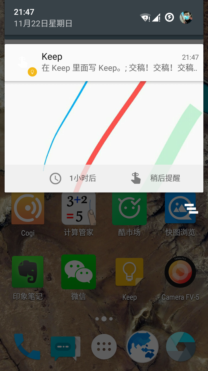 一旦满足了设定的提醒条件,Keep 就会发出提醒通知了。如果想延迟提醒,可以点击「1 小时后」或「稍后提醒」来自行决定下次提醒时间。而且在打开 Keep 后你会发现,发出过提醒的记事会自动提到所有记事的最前面,让你在打开 Keep 的第一眼,能够迅速发现这条已经失效的记事,同时也方便对其进行归档或其他操作,避免无效记事累积在第一页。