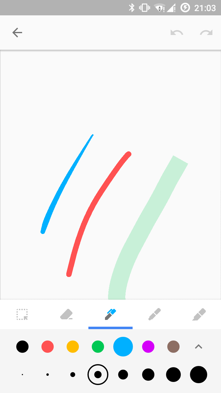 绘图好像是最近某次更新加入的新功能,如果脑中突然闪现文字不足以表达的灵感,那就可以在 Keep 中把它画出来。Keep 的绘图中包含了三种画笔,每种画笔都能调节笔刷颜色和大小;橡皮擦的设定比较另类,不是抹擦,而是点擦,不管画的多复杂,只要是一笔画出的东西,点其上的任一点就会把这整个图形擦除;框选功能可以对画布上被框选的图形进行移动,不需要框的多精确,主体大部分在内即可。