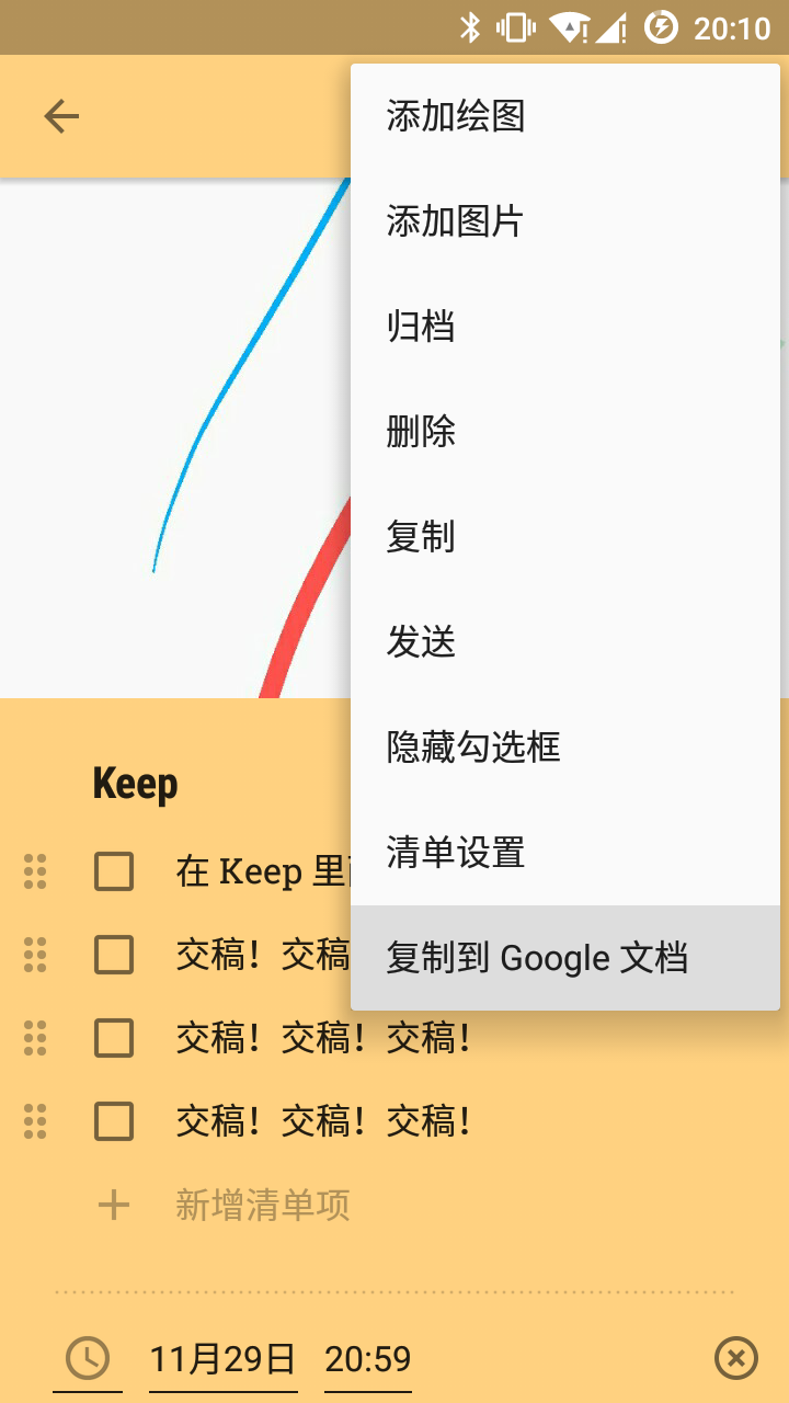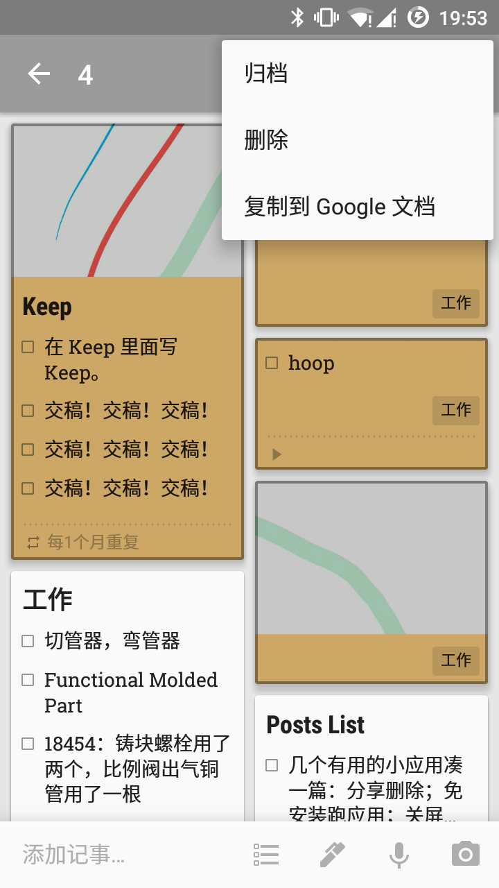 如果你还使用 Google 文档,那这个功能才比较有意义。「复制到 Google 文档」功能可以让你一键将 Keep 中的记事复制到 Google 文档中,记事的形式也会最大程度地得到保留。在理想状态下,用 Keep 列提纲,用 Google 文档来扩充也算是个不赖的组合吧。