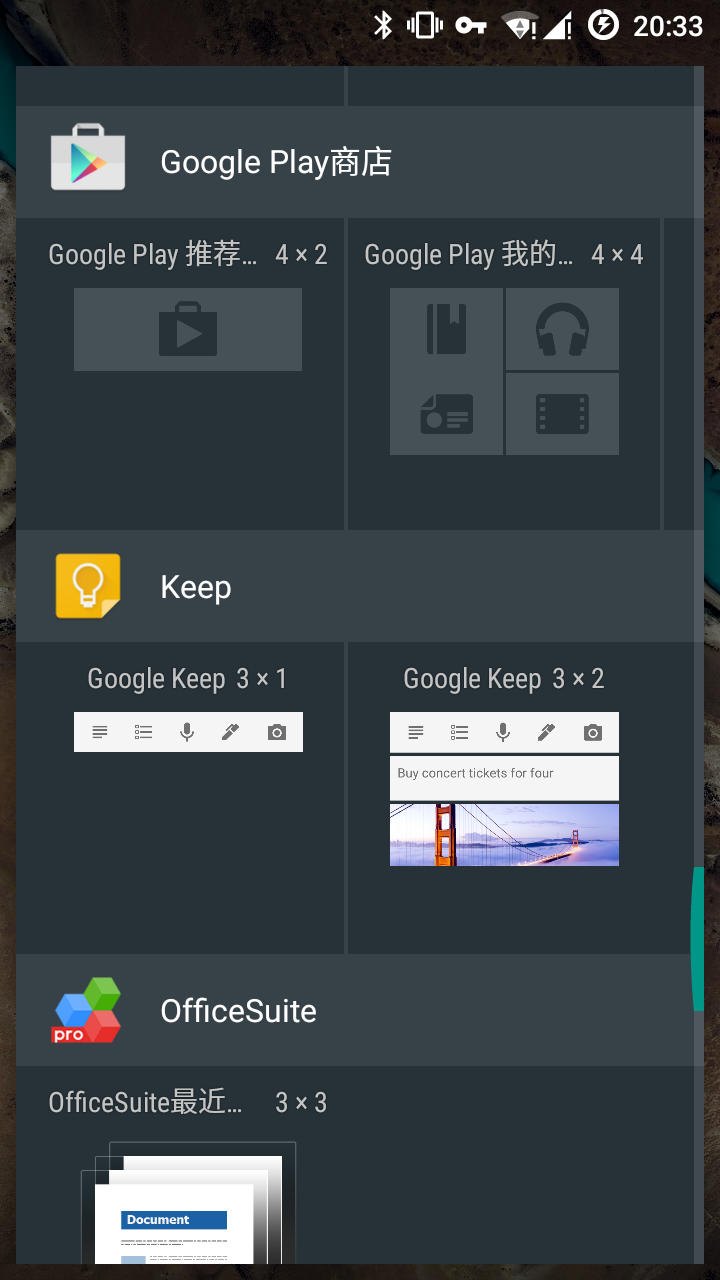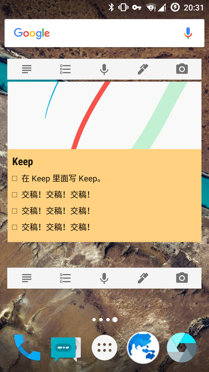 这种应用再没有桌面小部件,那就得遭不少人怨了。Keep 桌面小部件的功能,一是作为进入应用子功能的快捷入口,二就是显示部分记事内容。Keep 有两种尺寸的桌面小部件,3×2 和 3×1,3×2 可以缩成 3×1,3×1 就不能扩成3×2 了。小部件的颜色就这一个样,没有透明或其他颜色可选,单独拉伸填满一屏,与 Google 即时桌面融合的挺好。