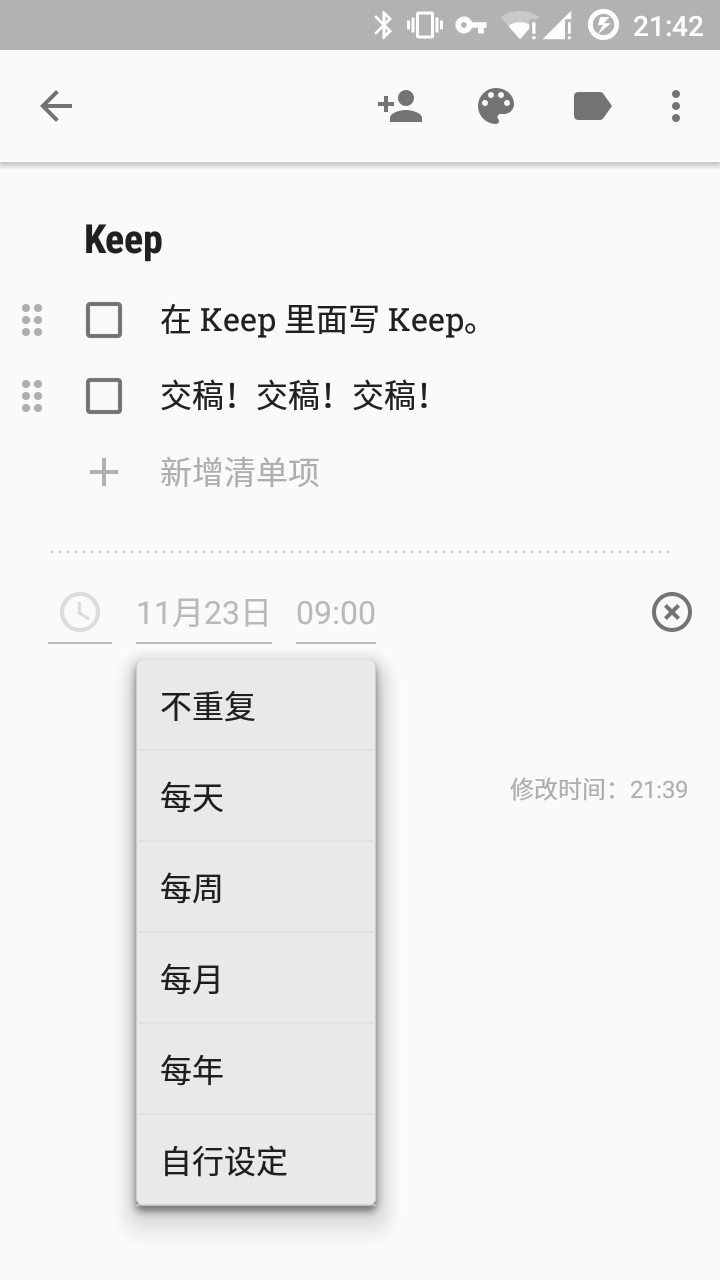 时间提醒的自定义项非常丰富,除了预先设定好的每天、每周、每月、每年重复外,还能自行设置每几天、每周周几、每月同一天、每几年重复等。对于在时间上非常有规律的待办事项,Keep 的时间提醒功能足够使用了。