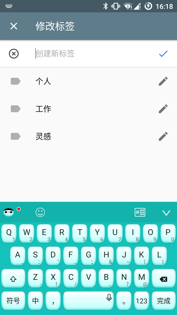 为了对不同类别的记事加以区分,贴标签是个很好的分类和整理方法,对于日后集中查看某一类的记事,标签功能无疑是非常便利的。Keep 的标签功能定义起来也是非常自由,虽然预设了个人、工作、灵感三个标签,但你可以编辑、删除它们,也可以创建新的标签。添加的标签会附在记事的右下角,看起来十分明了。
