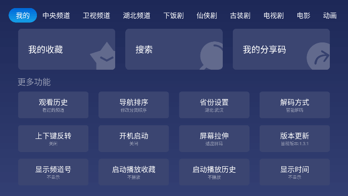 2、将选好的这个频道收藏,卫视频道也进行一样的收藏操作。接着在“我的”里,找到“启动播放收藏”、“启动播放历史”,设置为“播放”状态,这样下次打开的时候,就会自动播放收藏过的央视和卫视。如果需要换频道,只需要按上下键,跟以前的电视是一样的操作,对老人来说就简单多啦。