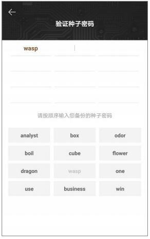 验证种子密码:为了确保您已抄写备份好种子密码,您需要按顺序输入上一步生成的 12 个单词(或数字、汉字)。如果输入错误,可通过点击错误位置,清空信息后重新输入。验证通过后将自动进入下一步。