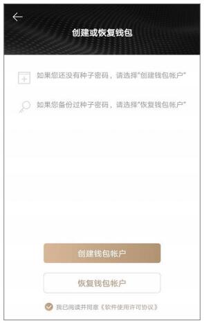 创建或恢复钱包:如您之前没有库神钱包或没有库神钱包种子密码可选择“创建钱包账户”,如您之前备份过库神钱包任意版本的种子密码则可以选择“恢复钱包账户”,以下将着重介绍如何“创建钱包账户”操作。