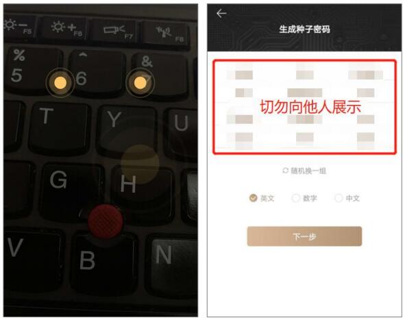 生成种子密码:为了确保种子密码随机性,系统将打开摄像头采集环境信息。种子密码由 12 个单词(或数字、汉字)组成,您可根据自己的喜好选择备份任一形式,可随机换一组新的种子密码。同时请将种子密码抄写到随机附带的种子密码卡上,以便恢复钱包账户使用,抄写好种子密码后点击“下一步”。