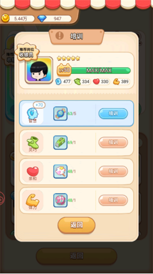 我们除了升级之外,还可以对员工进行培训操作,培训的方向对应员工的四维属性,分别是智慧、灵巧、亲和、体力,而提升这四维属性是需要消耗一定的培养材料呢,对应上述分别是聪明豆提升智慧、口香糖提升灵巧、棉花糖提升亲和、大力丸提升体力。