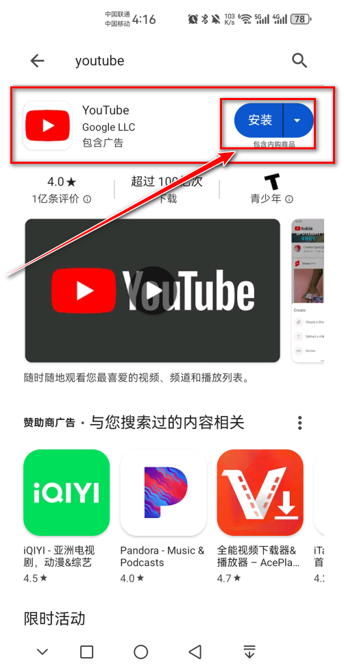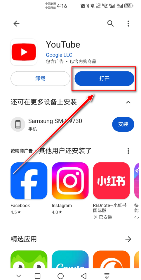 36.接下来小编给大家演示怎么下载软件,比如小编点击应用,接着在上方的搜索框输入YouTube然后点击搜索。