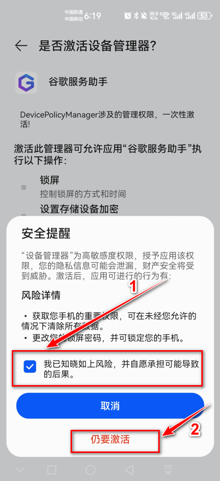 21.勾选我已知晓如上风险,并自愿承担可能导致的后果。点击仍要激活。