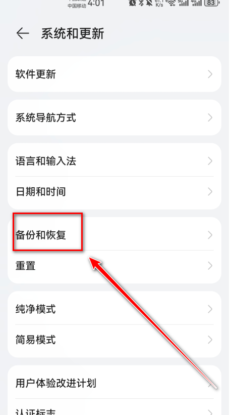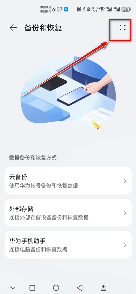 15.然后关闭备份和恢复的后台。重新进入备份和恢复,点击右上角四个点。