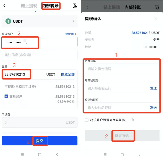 打开ok交易平台APP,选择【资产】栏—【提现】—选择币种【USDT】—选择【内部转账】—输入【提现账户】—【数量】—【提交】—按要求获取并输入相关密码/验证码—【确定提现】,完成操作。