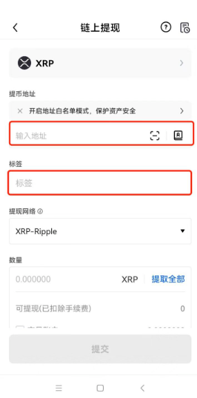 温馨提示:某些币种提现时还需要填写标签,标签通常是一串数字。例如XRP,在填写完提现地址后,下方的标签也必须填写,否则币会丢失。