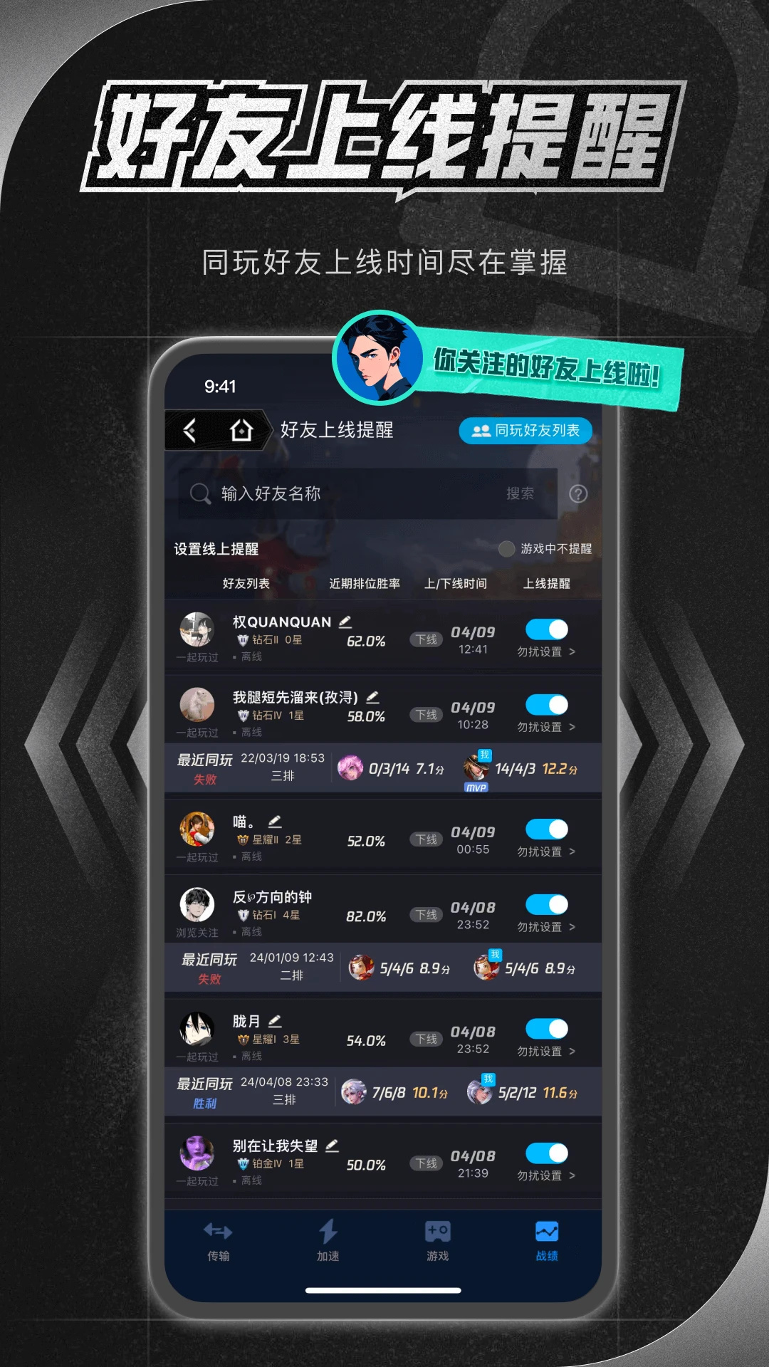 王者好友上线提醒、改名记录、战力查询、手速排行榜。