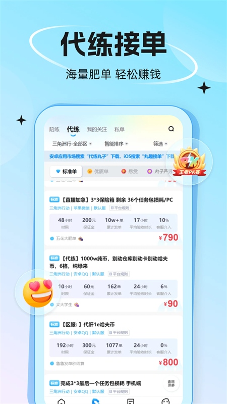 代练丸子app是一款口碑相当不错的手机专业代打代练平台软件,这款软件中拥有丰富的订单资源以及超多优秀的游戏代打,并且平台包揽了王者荣耀、原神、第五人格等时下热门的游戏,无论是需要大神代练的游戏玩家还是想利用闲暇时间做点兼职的游戏代打,都可以通过平台优秀的匹配机制得到满意的结果。此外,该软件还接入了芝麻分,提升了安全性。