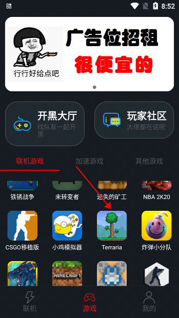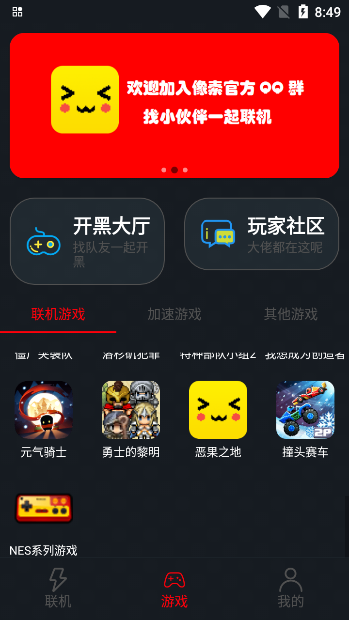 首先我们进入像素联机软件当中,在首页我们可以看到大量的联机游戏、加速游戏、其他游戏等等,然后进入到玩家社区;