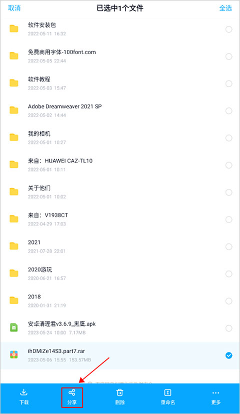 1、选择你想要分享给别人文件,选中之后页面将会出现在平时隐藏的选项,点击其中的“分享”选项即可开始分享,如下图所示: