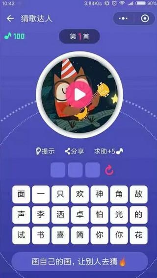4、游戏页面一目了然,上面是歌曲,下面是答题卡,点击播放按钮听一听,然后把你想的答案输入到下面的答题卡中,正确的话进入下一局,错误了只能从新来过,或者寻找好友帮助。