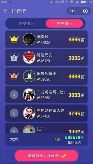 6、排行榜这个东西可以很好的刺激用户的心理,这个小游戏也有一个排行榜,在首页下方有一个排行榜,在排行榜中,你可以看到自己在好友之中的排行和一个世界的排行榜。看完之后是不是又开始答题了呢?