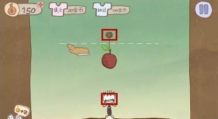 这关也是不要给误导咯,点击红框就是苹果上方挂着的按钮,然后等少年的嘴巴张开吃掉就过关了。