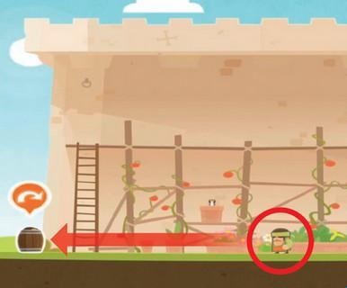 2、找到躲藏在房檐下的松鼠,解开墙上热狗的绳子,使热狗掉落之后迅速回到木桶中隐蔽。