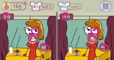 第十四关攻略:本关卡是要找出5处不同的地方,玩家只要根据图上圈中的地方进行点击,找到4个后,再将滑动左边图片的牛奶,将杯子弄空,再点击右边图片的杯子即可过关了。