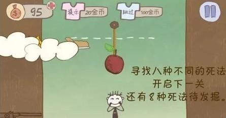 4.被苹果砸死:玩家只要滑动切断小贱男头上吊着苹果的绳子,苹果就会砸死小贱男了。