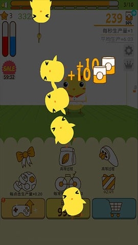 手机版小鸡可以出去,要得到许多的罐头,天花板掉下一把钥匙,小鸡出去了,然后看到了外面的鸡肉工厂,2次出去还会变成小鸡骑自行车出去。小鸡出去后,你会得到这游戏的另一个货币 钥匙 ,钥匙可以升级自动罐头产生的速度,提升小鸡出生的体质,让小鸡一出生做成罐头是高级罐头,能拿到更多的罐头,足球变成了每点击一下产生n个罐头,n的数值取决于你有没有用罐头升级,吃饭和洗澡是可以让小鸡变成高等罐头的过程。